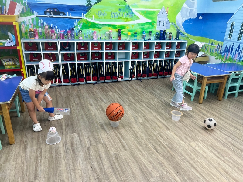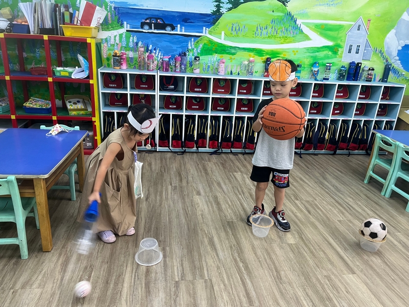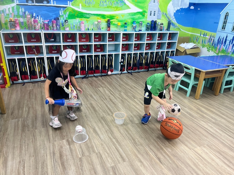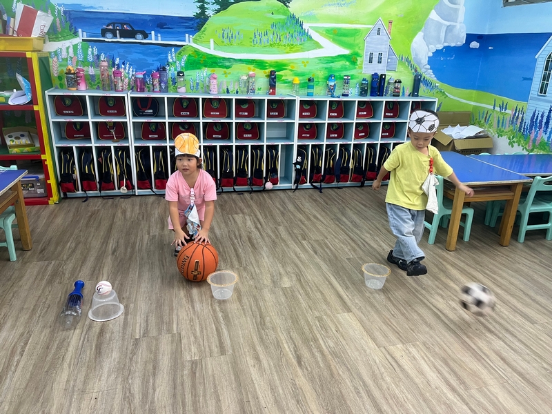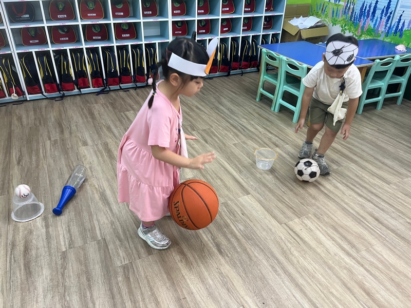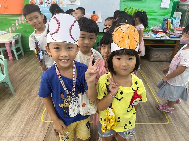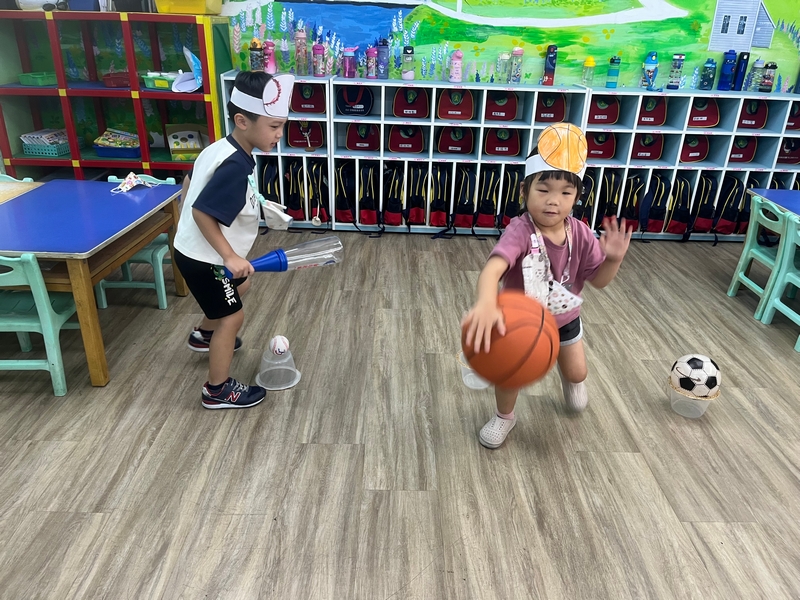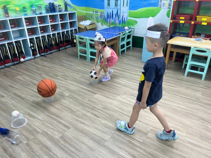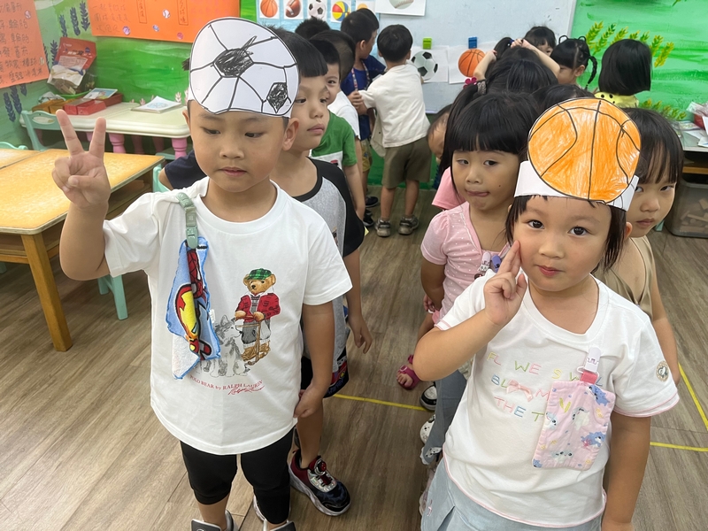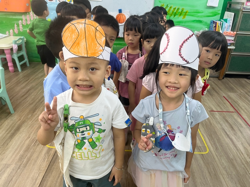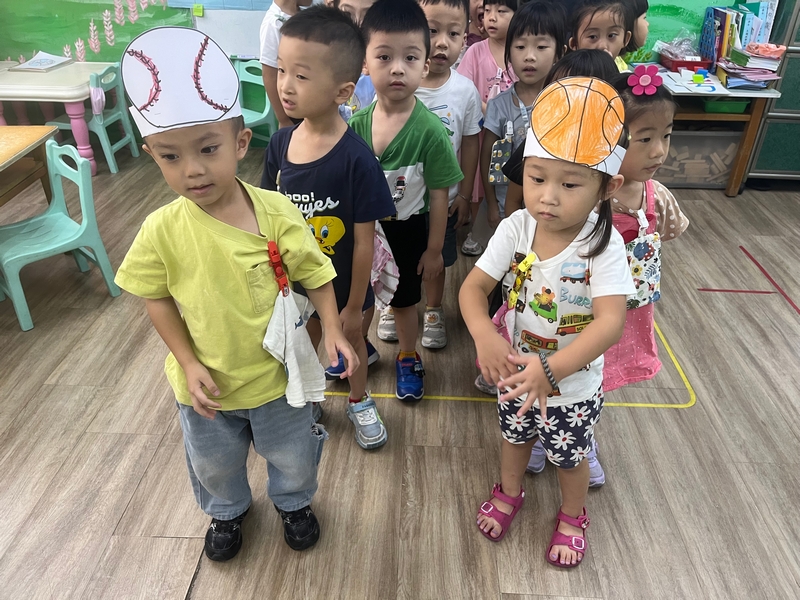 讓孩子戴上各種不同球的頭套,依照頭套上的圖案去找出正確的球。並依球的運動方式,表現出來;例如:足球就用腳踢,孩子很棒都能一一地做出動作來唷!