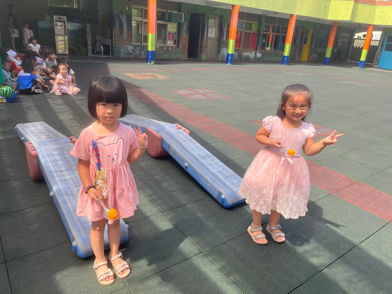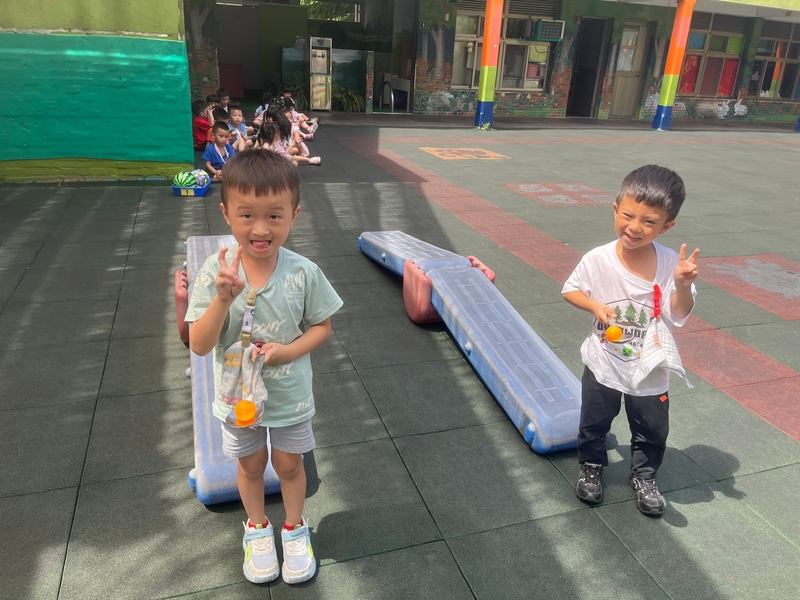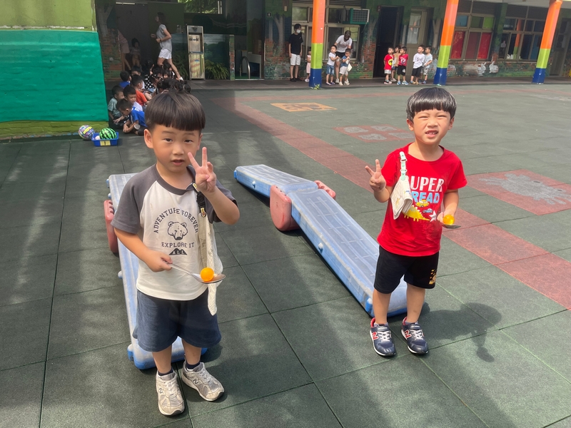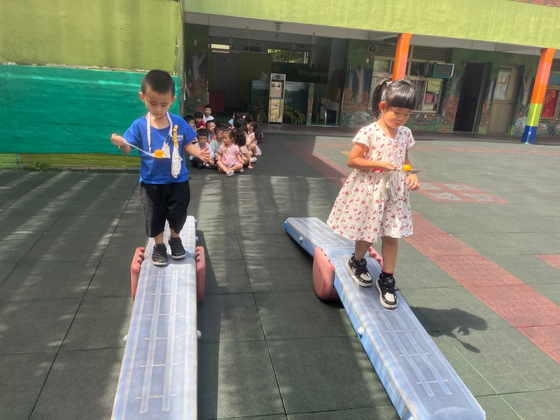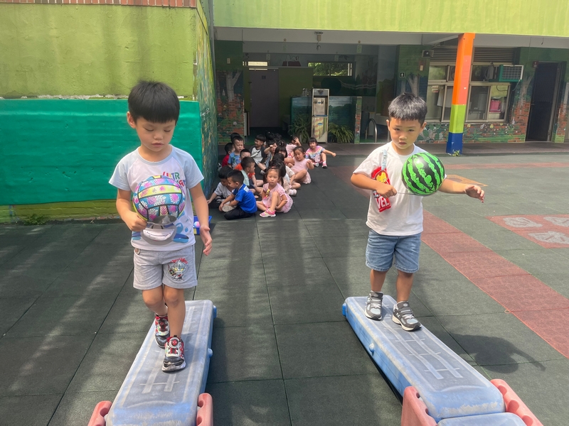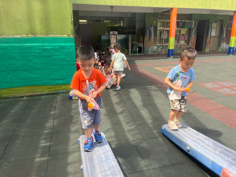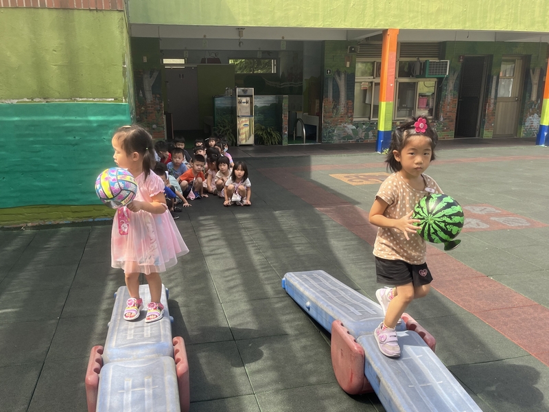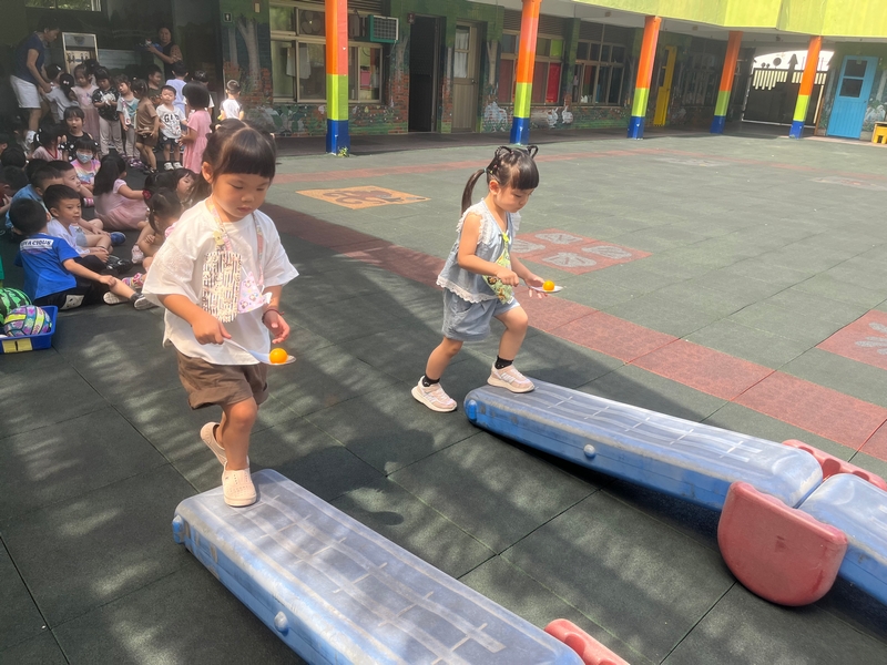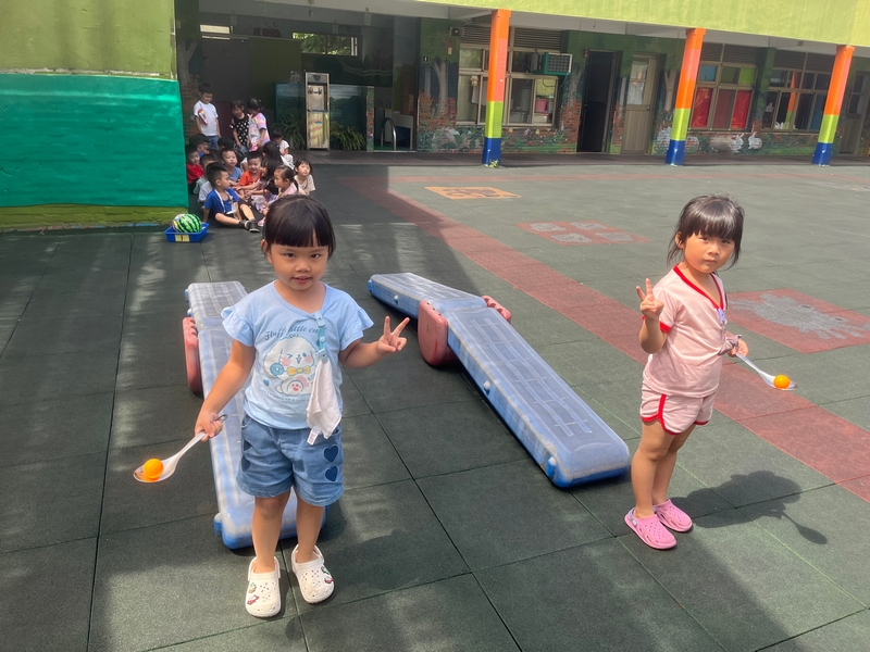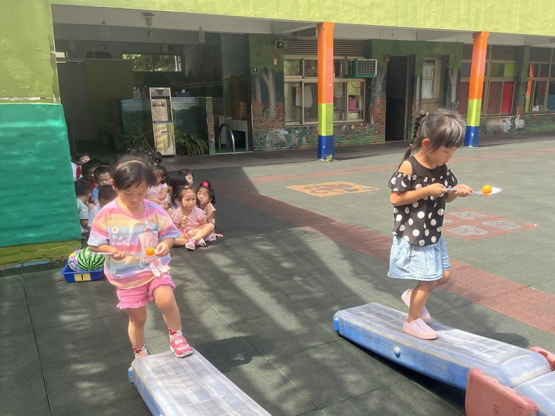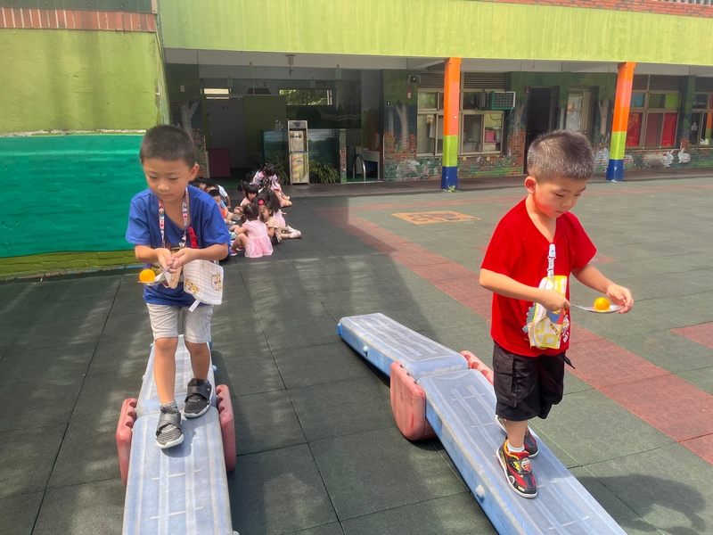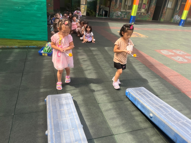 利用湯匙來傳送大、和小顆的球,有的小朋友很厲害,走過好漢坡也能穩住球,不讓它掉下來;藉由此活動可訓練孩子的平衡性、和穩定性喔!